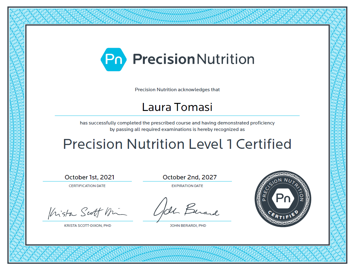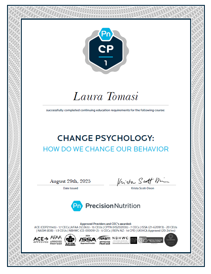 Ho scelto di formarmi con Precision Nutrition, l'autorità mondiale nel campo del coaching nutrizionale. Il loro metodo non si basa su diete rigide, ma sulla scienza del cambiamento comportamentale e sulla fisiologia, per ottenere risultati duraturi. Continuo ad aggiornarmi ogni anno con loro.