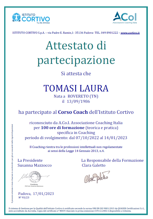 Per accompagnarti nel modo più efficace, ho consolidato le mie competenze di coaching attraverso il Corso Coach presso Istituto Cortivo riconosciuto A.Co.I. Associazione Coaching Italia, che garantisce etica e standard elevati.